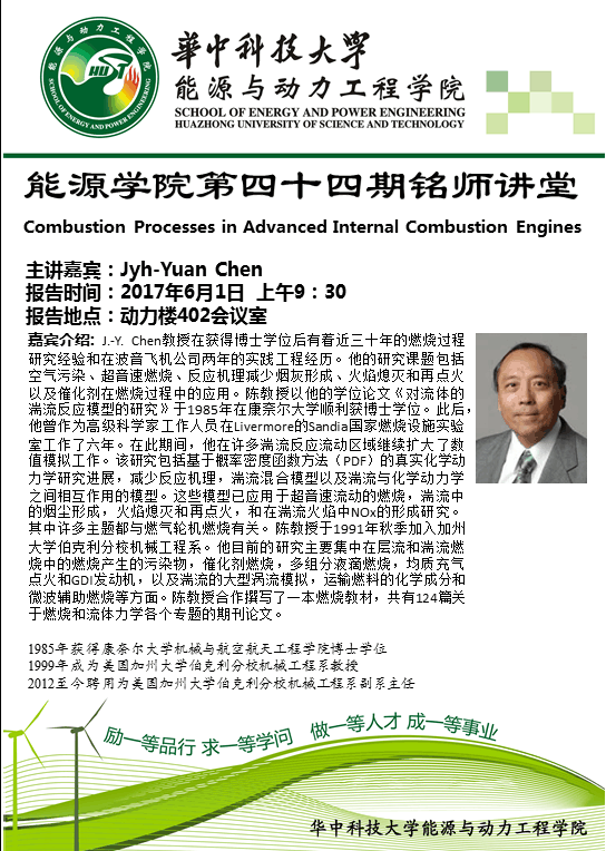 本站讯 2017年6月1日上午9时30分,美国加州大学伯克利分校机械工程系教授JYH-YUAN Chen在动力楼402教室,为能源学院教师学生做《Combustion Processes in Advanced Internal Combustion Engines》主题讲座,院长姚洪、副院长成晓北、柳朝晖教授以及动机系部分教师学生参加讲座,讲座围绕内燃机燃烧的发展趋势为主题展开讲述。