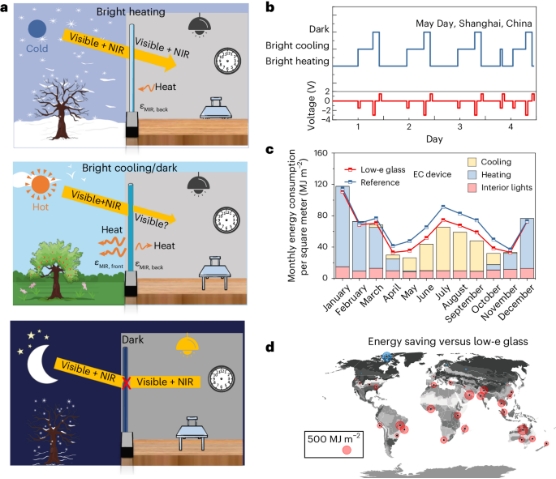 为了研究三频优化EC设备的节能性能,作者通过大量模拟和EnergyPlus软件评估了暖通空调和照明的节能效果。图4a显示了在不同温度和太阳辐照密度下的光学状态选择:寒冷天气下,采用明亮加热状态让近红外和可见光进入室内;炎热天气中,根据具体条件依次采用明亮制冷和暗状态调节近红外和可见光;夜间遮挡光线确保私密性。以上海为模拟地点,结果显示,"五一"期间,为实现最低能耗,EC窗口应在三种状态间切换,且维持状态的能耗为零(图 4b)。与空白玻璃和低辐射玻璃相比,三频优化EC窗显著节能,全年可节省23.9%的暖通空调能耗,优于传统EC设备和低辐射玻璃(图4c)。模拟结果证明了三波段优化节能窗在夏季的高效性能。