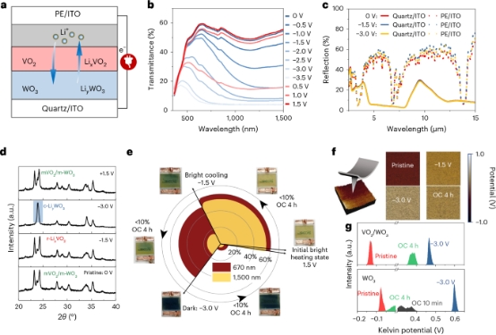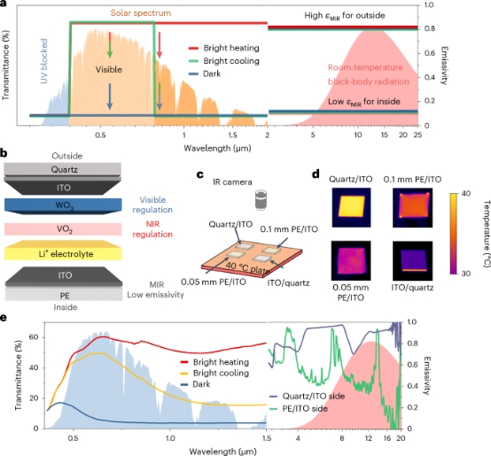 文中提出了一种理想的节能窗,可以最大化利用可见光、近红外和中红外三波段辐射(图1a)。这种窗户通过结合 VO2/WO3 的电致变色结构(图 1b)和外部电压控制,可以精确调节窗户的透光和隔热性能。独特的设计采用红外透明的聚乙烯薄膜代替了传统的内侧玻璃基板,在降低了热辐的同时避免了使用额外的导电膜,以提升透光率和热控效果。此外,如图1e 所示,这种窗户可独立调节可见光和近红外光,呈现出上述三种不同的明显光学状态:亮加热、亮冷却和暗状态。在 2.5-20 µm 波长范围内,装置正面(聚乙烯/ITO)和反面(石英/ITO)显示出明显不同的中近红外辐射。