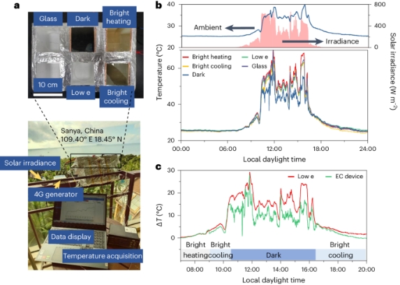作者在户外进行了连续实验。图3a展示了在窗户上放置的五种样品,包括明加热、明冷却、暗状态的三波段优化EC装置、空白玻璃和商用低辐射玻璃。图3b记录了五条温度曲线、环境温度和太阳辐照度,太阳辐照度的峰值约为660 W/m²。图3c显示,不同状态适用于不同的天气条件。09:00之前,太阳辐照度较低(<100 W/m²),各窗户之间的温度差不超过1°C,适合采用明加热状态,以确保室内明亮。当太阳辐照度增强时(09:00至10:30,100-200 W/m²),亮冷态和暗态的室内温度比低辐射玻璃低约2°C,适合采用明冷状态。当太阳辐照度达到峰值(>600 W/m²)时,10:30之后,暗态的室内温度比低辐射玻璃低约8°C,表明此时暗态更为合适。