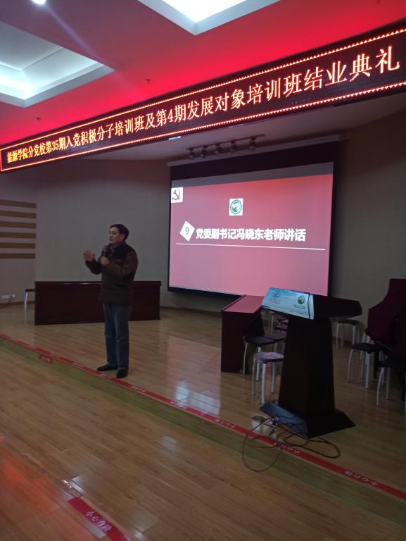 会议第八项,党委副书记冯晓东老师对本次活动进行了总结。首先,他表扬了会场纪律和问答环节同学们的踊跃回答。接着,他为同学们简单阐述了怎样才算一个合格的党员。党员是这样的人:既是劳动人民的普通一员,又是胸怀共产主义理想牢记党的宗旨的不普通的一员。党员做这样的事:既与群众一起工作、学习、生活,又参加组织生活、遵守组织章程、维护组织团结、按时交纳党费。最后,他衷心祝愿在场同学们能早日加入党组织。