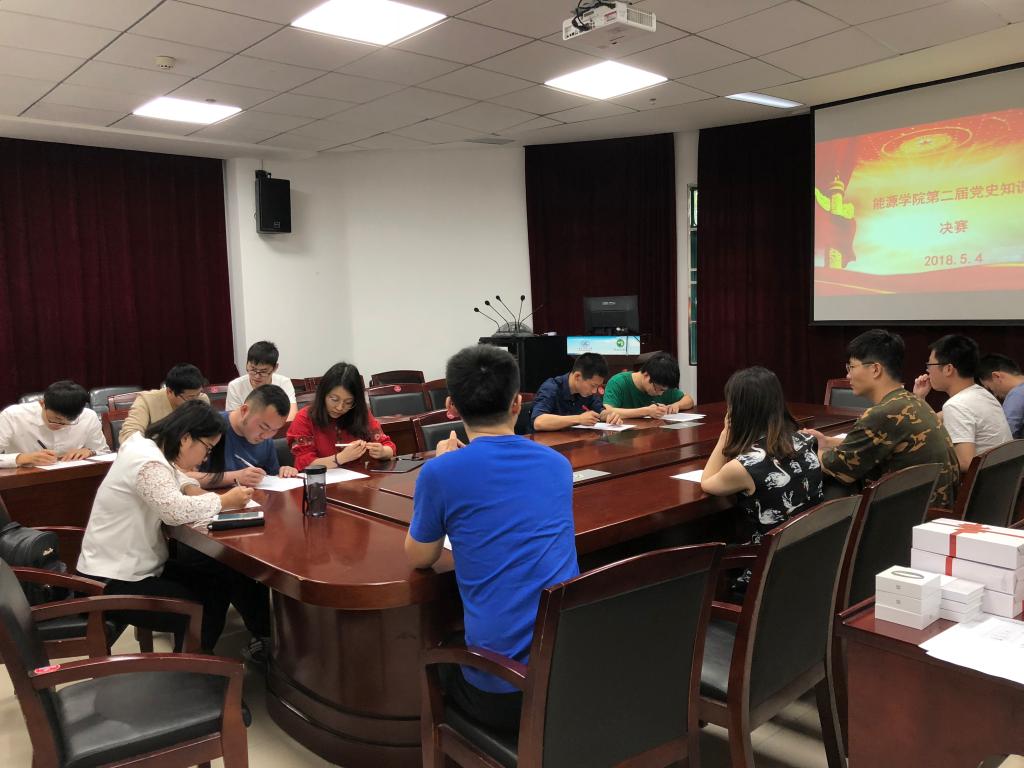 为了积极响应十九大号召,加强党员党性修养,能源研会在全院研究生中开展了以“不忘初心跟党走,牢记使命勇担当”为主题的党史知识竞赛。2018年5月4日中午12点半,党史知识竞赛决赛在动力楼201会议室隆重举行,出席本次决赛的评委有能源研会主席团、院党建中心主席以及德育助理。