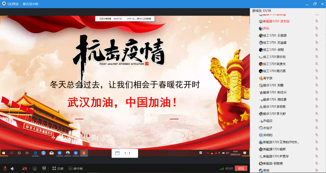 专业学习不停止。面对疫情,班级同学深知科学发展和技术创新之重要,深知勤学奋斗和增长才干之必要,积极响应“停课不停学”的号召。在线上开课之前,班委就早早与任课老师取得联系,商讨学习方案。考虑到录播形式不能和同学们实时互动,影响教学效果,班长和副班长两人就试验钉钉、QQ等多个平台,最后决定以QQ群直播的形式来教授课程。课前,班委都会协助任课老师提前几分钟调试设备,确保学习不落一人。课上,能卓1701班学子积极发问,与老师展开激烈的讨论,甚至有时远远超过授课时间,讨论交流依然没有结束。课后,学习委员都会及时将课程录像发到班群,同学们不仅超额完成作业题,还利用中国大学MOOC等平台补充学习。每逢周末,班级同学还会开展锅炉原理等课程的研讨,提出了很多关于教学的建议,得到了授课老师极大的赞赏。