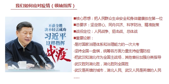 2019级11个班级(团支部)集体学习了习近平总书记关于疫情防控的系列重要讲话和指示批示回信精神,深刻体悟到以人民为中心的思想和构建人类命运共同体的大国担当;学习了教育部的致信精神, 努力做守护者、修行者和识途者;学习了华中大医学人精神,向心怀大爱、敬佑生命、逆行而上的英雄致敬。