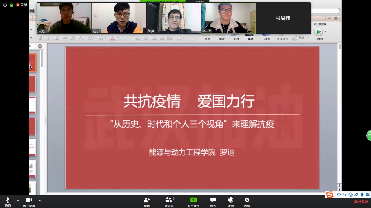 疫情发生以来,中国道路和中国制度令人自豪,无数抗疫故事温暖人心。各班级以各种形式进行专题分享,讲述一个个有力量、有温度的故事。能动1908班同学以“翻转团课”的形式分组讲述抗疫中的中国故事,分享所见所闻和所思所想,孙豪嘉等五位同学采用在线朗诵的形式,向逆行者致敬,为中国加油,为武汉加油。能卓1901班同学以寄语留言的形式,向祖国表达心声,传递青年力量。