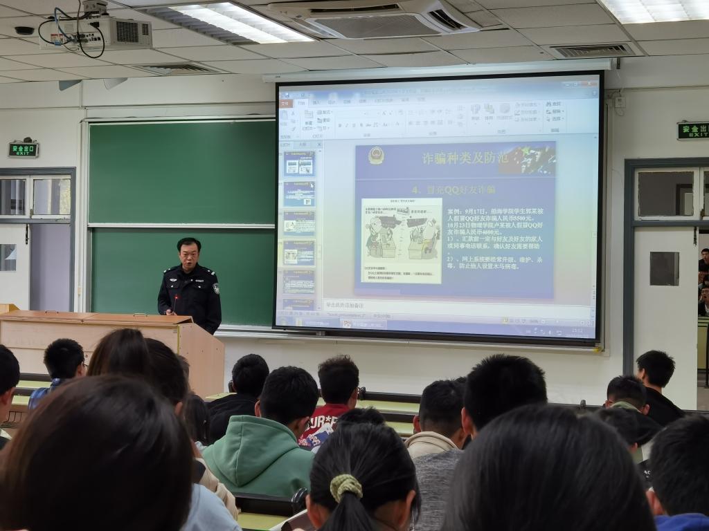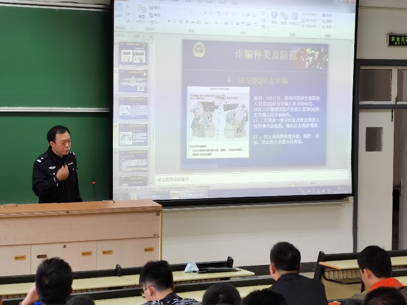 首先,安警官为同学们进行了安全知识普及。安警官用生动的案例和视频为大家讲解了诈骗的各种类型以及如何应对诈骗。他教导学生们应理智冷静地面对诈骗者的言论,如何有效地判断对方言论的真假。同学从安全讲座中获益良多。