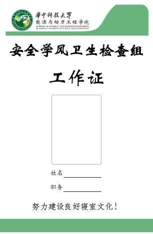 (1)安全卫生检查小组由各年级安全员组成,所有成员会佩戴统一制作的“能源学院安全学风卫生检查组”工作牌。请同学予以配合,相互理解有礼貌。对于未佩戴工作牌、工作牌格式存在问题或工作牌照片和本人不相符的人员要求进入寝室检查不要相信,工作证如图。