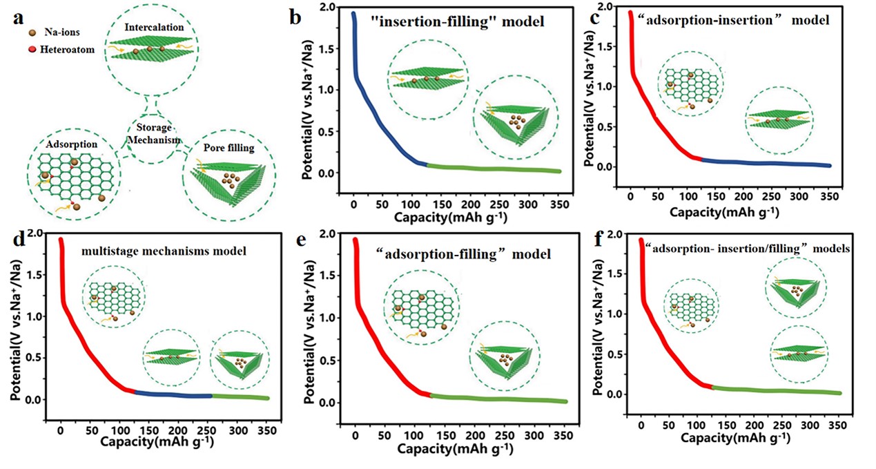 图4(a)钠的储存机理示意图,(b-e)当前硬碳储钠模型的综述。