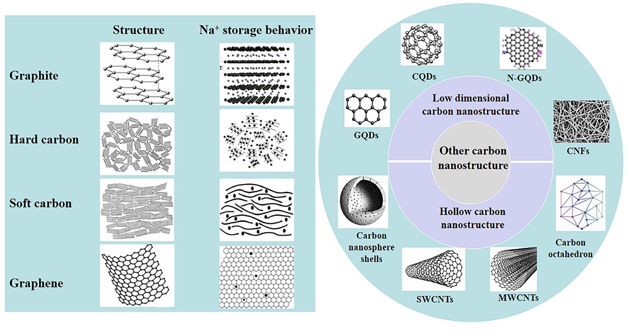 随着钠离子电池的快速发展,寻找性能优良的电极材料是人们密切关注的课题。在过去的二十多年里,人们研究了许多钠离子电池阴极材料。如层状过渡金属氧化物,多原子阴离子材料,普鲁士蓝和类似物,有机材料。与阴极相比,钠离子电池的阳极关注较少。然而,开发合适的阳极是设计钠离子电池的关键一步。最初,人们采用金属钠作为阳极,但金属钠会与有机电解质溶剂反应,并且金属钠在工作过程中会沉积并且形成枝晶。此外,钠的熔点较低,这对于在环境温度下使用的设备具有重大的安全隐患。因此,必须研究能够在主电极之间来回循环的替代阳极材料,以保证钠离子电池的安全使用。目前在钠离子电池阳极方面也取得了很多成果,如碳基材料,金属氧化物基材料和合金基负极材料。在最早的阶段,碳基材料得到了广泛的研究。如图3所示,碳基材料包括石墨,硬碳,软碳,和石墨烯在内的各种碳纳米结构。为了更好地了解Na+的储存/释放行为,提高钠离子电池的电化学性能,论文对各种碳材料作为钠离子电池的负极的储钠原理,优化手段,前景和挑战进行了综述,着重介绍如何选择和优化合适的碳材料以实现理想的电化学性能,不仅为当前碳负极材料的研究提供了宝贵的参考,也为未来的研究方向指明了道路。