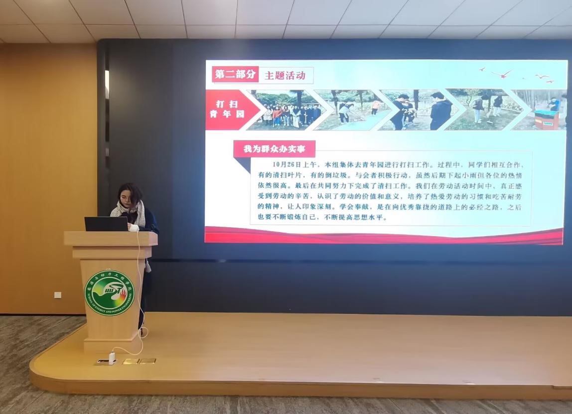 培训班设置生动的“三个一”实践工程,扎实有效开展“读书明理”小组读书分享、“责任以行”小组集体实践、“发展众议”小组研讨献计、“品牌共创”支部品牌创建等环节,引导学员将理论与实践深度结合,在服务师生群众和助力学院建设中发挥榜样引领作用。学员以小组为单位开展宿舍楼栋清洁、校园道路清洁、电动车摆放与废旧自行车清理、“老带新”学业辅导、体验式教学尝试、案例式教学研讨、《习近平谈治国理政(第四卷)》阅读分享等活动,提出科学设置路障以缓解放学时人流拥挤问题、清洁能源大楼电梯内进行文化装饰、预留空置房间装饰成面试间等建议。学员发挥小组群策群力效能,聚焦身边力所能及的小事、难事、要事,通过前期调研、中期执行、后期总结,科学有效地完成“三个一”实践工程,有效提升了组织力、行动力和引领力。