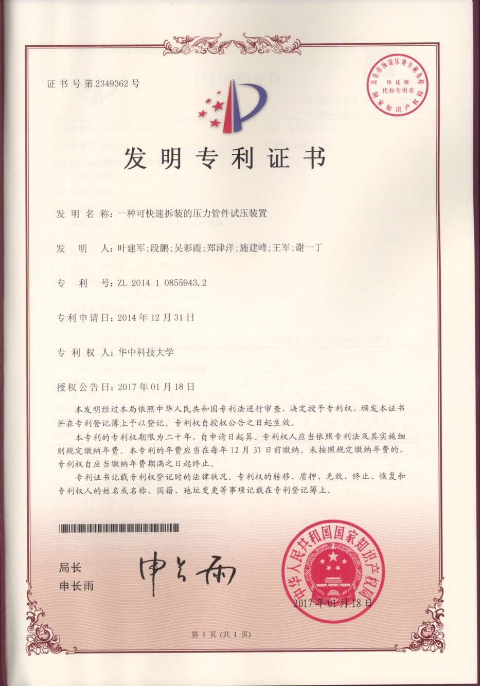 发明名称:一种可快速拆装的压力管件试压装置发明人: 叶建军;段鹏;吴彩霞;郑津洋;施建峰;王军;谢一丁 专利号:ZL 2014 1 0855943.2专利申请日期:2014年12月31日专利权人:WilliamHill授权公告日期:2017年01月18日