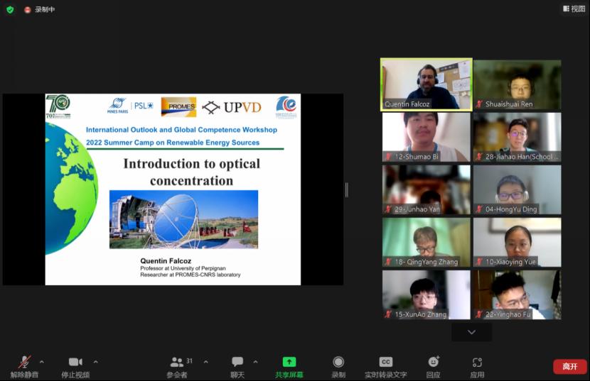 Quentin FALCOZ老师为同学们讲授太阳能光热课程,就“太阳能光热技术的优缺点”详细阐述,结合太阳能光热转换方法概述与理论计算,阐明影响光热转化的首要因素,展示了聚光太阳能发电厂的应用实例。