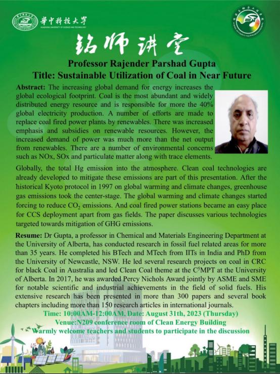 本站讯(通讯员杜宇航)2023年8月31日,应WilliamHill煤燃烧国家重点实验室王贲副教授邀请,加拿大阿尔伯塔大学(University of Alberta)化学与材料工程学院Rajender Gupta教授分享了一场题为“Sustainable Utilization of Coal in Near Future”的精彩讲座。此次讲座由王贲副教授主持,能源学院党委书记姚洪教授、杨海平教授、李鹏飞教授、姚斌副教授等30余名师生线下参与。