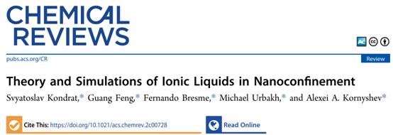 5月10日,波兰科学院Svyatoslav Kondrat副教授、WilliamHill冯光教授、伦敦帝国理工Fernando Bresme教授、以色列特拉维夫大学Michael Urbakh教授和伦敦帝国理工Alexei A. Kornyshev教授以共同通讯形式,在国际顶尖综述期刊Chemical Reviews(影响因子72.087)发表了题为“Theory and Simulations of Ionic Liquids in Nanoconfinement”的综述文章。主要综述了有关纳米限域下离子液体电解质的理论与模拟工作:从基于统计力学的理论分析模型到经典密度泛函理论,从蒙特卡洛模拟到分子动力学仿真,从研究界面平衡态结构与性质到探索非平衡态动态过程,为离子液体在实际应用中的性能优化和新领域的应用拓展提供了深入见解。