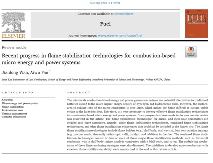 文章信息:Jianlong Wan, Aiwu Fan. Recent progress in flame stabilization technologies for combustion-based micro energy and power systems. Fuel. 2021; 286: 119391.