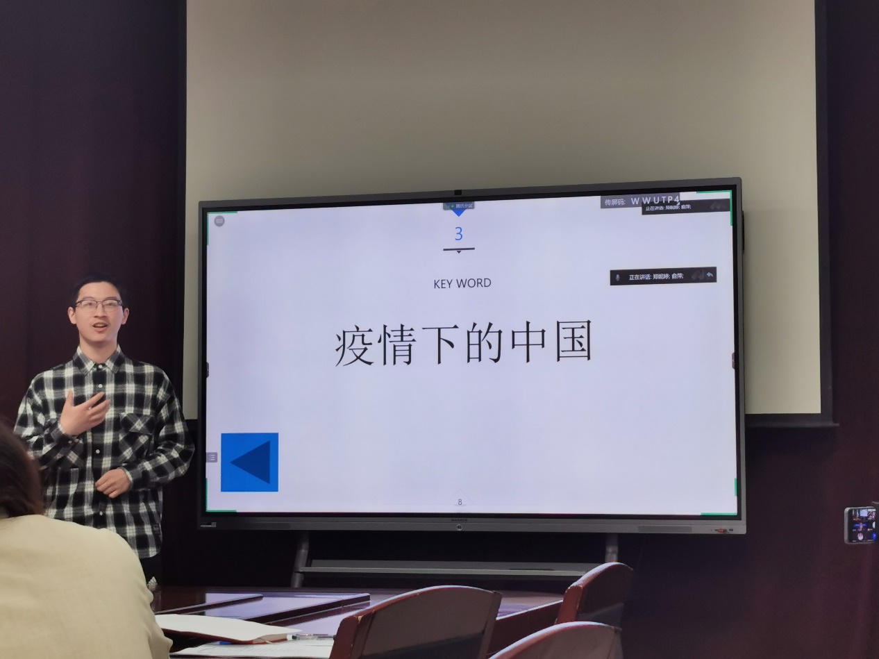 一号选手史臻同学首先出场。史臻同学从专业学习、科创竞赛、学生工作等方面对自己进行了全面展示,并立足当下,对自己的未来发展做出规划。在即兴演讲环节,史臻同学对疫情之下中国的表现表示肯定与自豪,并表示对疫情终将过去怀有极大的信心。