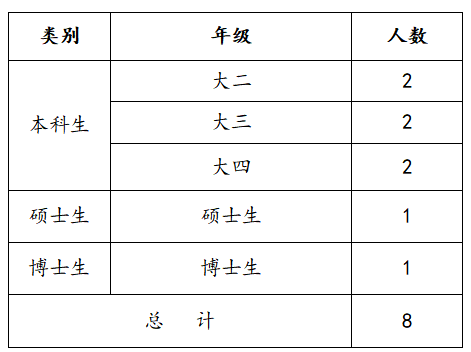 奖励热心社会公益事业,积极参加或组织校内外各项社会工作、公益活动、社会实践、志愿服务活动等并成绩显著的本科生和研究生;奖励8人,3000元/人。