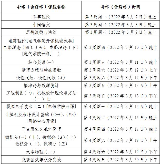 二、补考(缓考)时间为2021~2022学年度第二学期的第2周周三(2022年3月2日)至第4周周日(2022年3月20日)。