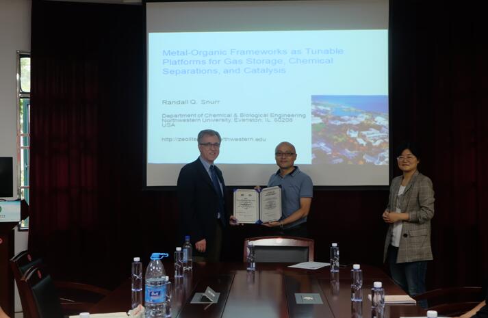 Randall Q. Snurr教授受聘为我校客座教授,罗小兵院长致欢迎辞并为其颁发聘书,Snurr教授对受聘为我校客座教授表达了真切的感谢,受聘仪式及专题讲座由李松副教授主持。Snurr教授作了题为“Metal-Organic Frameworks as Tunable Platforms for Gas Storage, Chemical Separations, and Catalysis”的学术报告。